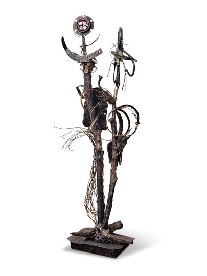 Génie animal ou végétal dans l’imaginaire amérindien, la sculpture TOTEMS emprunte ce sens en le transposant aux êtres. Tel un objet rituel avec ces morceaux de fer épars, assemblés les uns sur les autres en équilibre, elle est un hymne à la fragilité du lien.