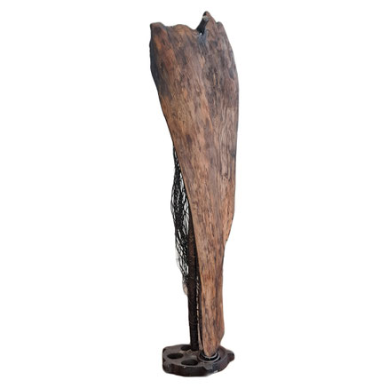 bois de grève transpercé par des clous. La base noire donne à la pièce une impression de